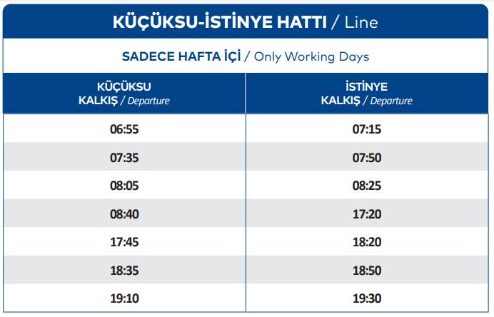 Kış sezonuna göre düzenlenen İstinye Çubuklu arabalı vapur tarifesi seferleri 16 Eylül 2019 Pazartesi günü başlayıp 31 Mayıs 2020 günü son bulacak. Küçüksu - Beşiktaş - Kabataş.